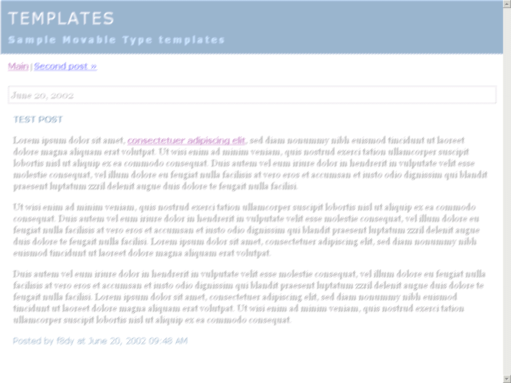 The default Movable Type template is more complex than the Radio templates, but we're going to do the same thing, just more of it. In your Stylesheet template (styles-site.css), add this at the end: